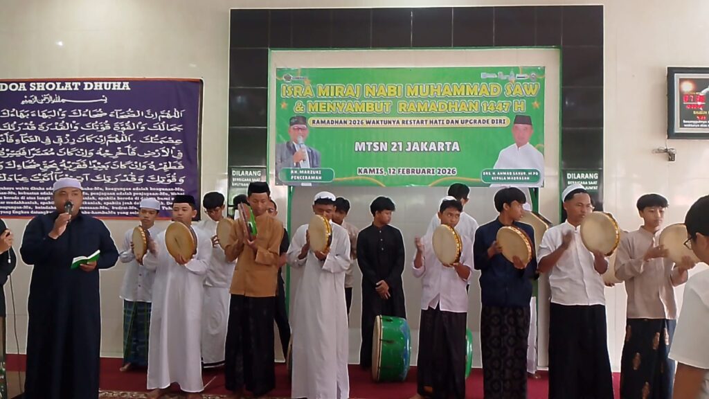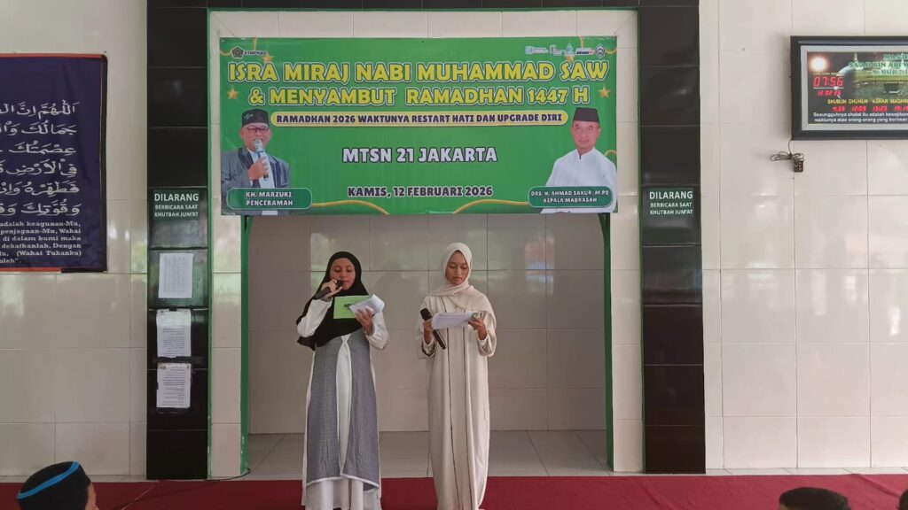 Humas MTsN 21 Jakarta; Kamis, 12 Februari 2026. Peringatan Isra Mi’raj dan Menyambut Bulan Ramadhan 1447 H. Dengan mengusung tema “Ramadhan 2026 Waktunya Restart Hati & Upgrade Diri.” Kegiatan diawali dengan absensi, tadarus, sholat dhuha, dilanjutkan dengan penampilan hadroh, pembukaan, pembacaan ayat suci Al Quran, kisah isra mi’raj, dan penampilan sambung ayat dari anak-anak tahfidz, kegiatan diakhiri dengan penyampaian tausiah agama dari KH. Marzuki.
